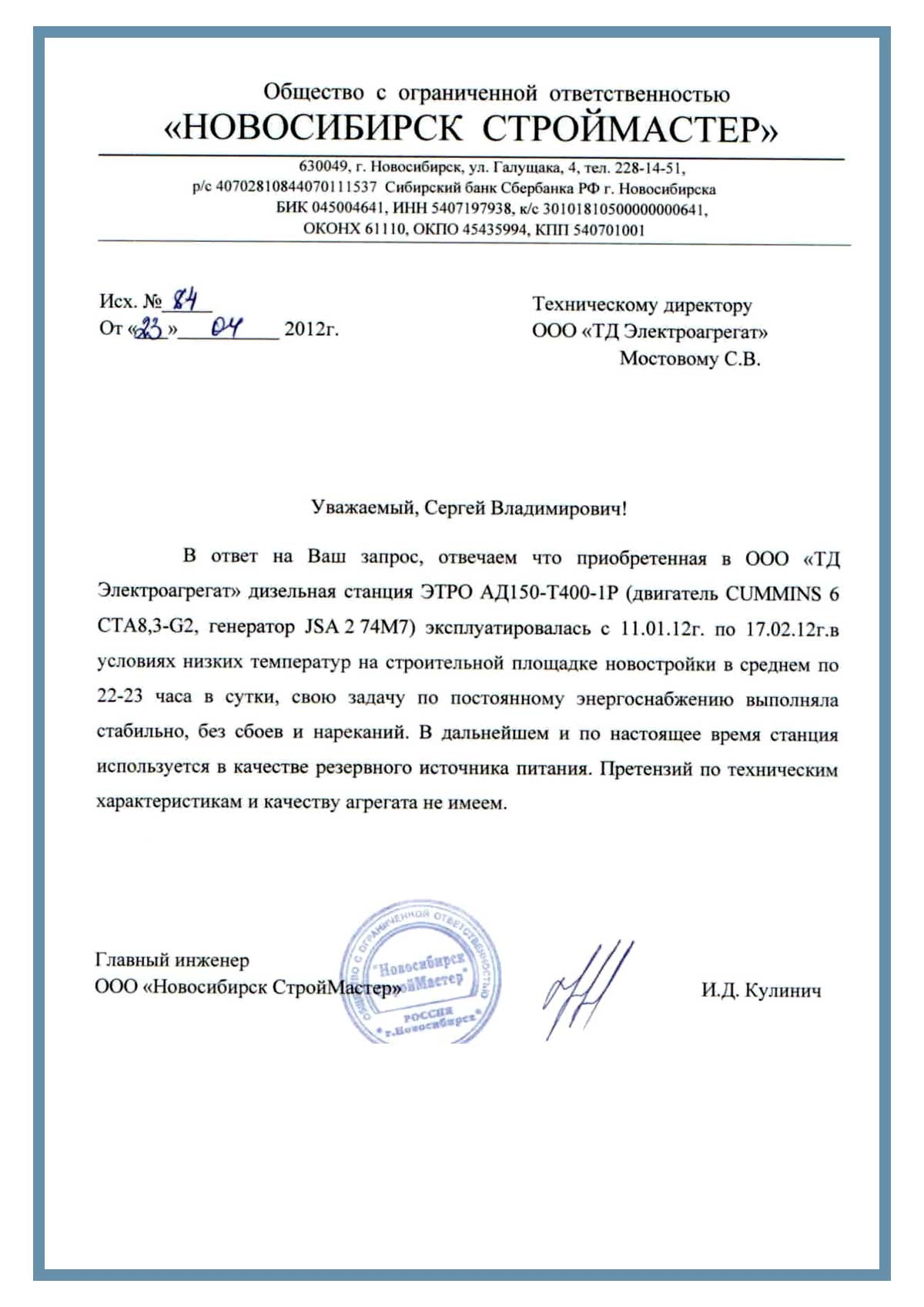 Отзыв контрагентов о компании ООО «ТД Электроагрегат» и  исполненном проекте для ООО "Новосибирск Строймастер" г. Новосибирск