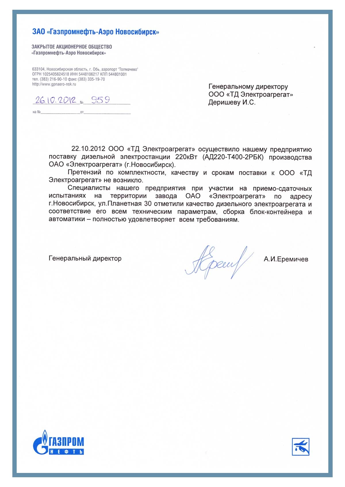 Отзыв контрагентов о компании ООО «ТД Электроагрегат» и  исполненном проекте для ЗАО "Газпромнефть-Аэро Новосибирск" г. Обь